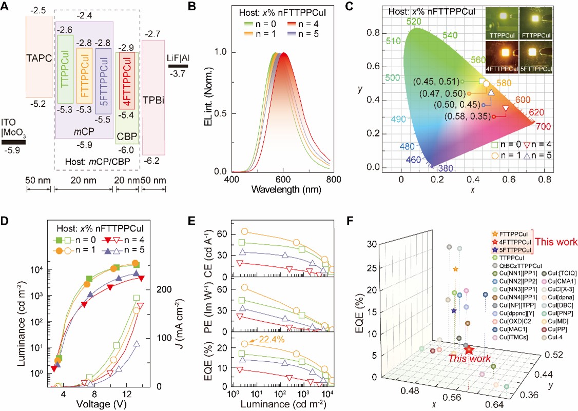 同时,基于这些含氟铜碘配合物构建的器件实现了红色电致发光,最大发射波长超过600 nm,外量子效率超过20%。值得注意的是,4FTTPPCuI器件实现了理想的红色电致发光,其CIEx超过0.56,展现出首例红色双发射铜配合物。该工作不仅证明了通过官能团电子效应实现可控激发态优化的可行性,也展示了双重发射体系在实际显示与照明应用中的潜力。